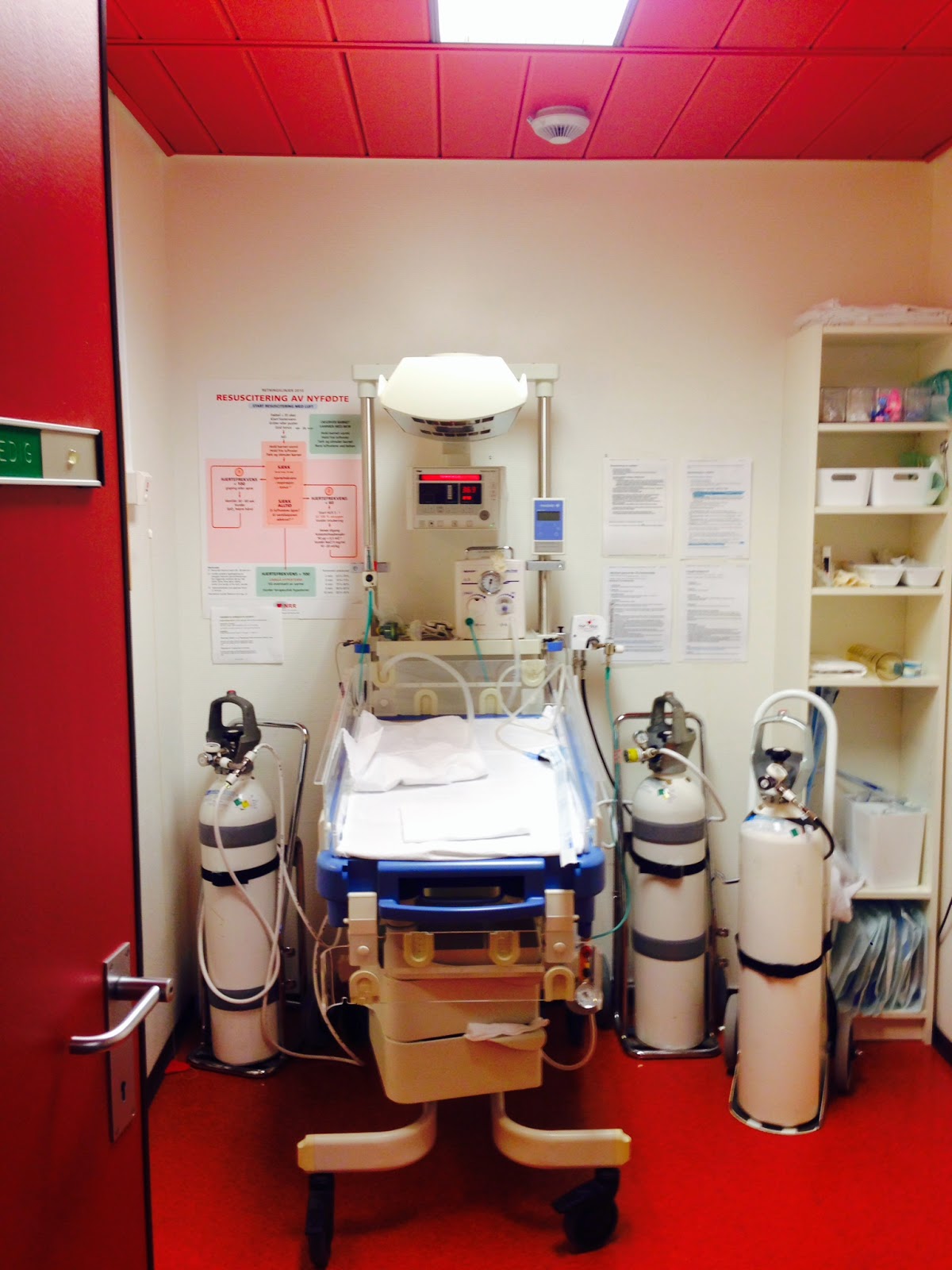 After we left the birth loft we went down to the 1st floor which is the traditional delivery floor. These rooms were standard hospital rooms, but most of them still had a birth tub and a view of the fjord out the window so that was nice. If there are any complications or reasons that the labor/delivery is not progressing normally, you would be able to head straight down to the 1st floor to receive any necessary medical intervention. Across the hall from the delivery rooms was the infant warmer and equipment in case there were any issues with the baby.
